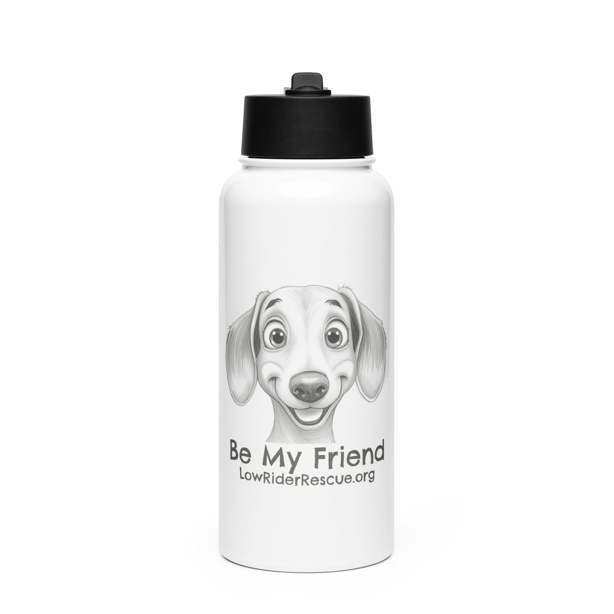 Stay hydrated all day with this 32 oz (950 ml) water bottle. It’s ideal for workouts or busy days, with a wide-mouth foldable straw for spill-free sipping and a rotating handle for easy carrying. "Be My Friend" water bottles are the best way to show your support for our rescue! All proceeds from the sale of our Be My Friend line will be donated to lowriderrescue.org.